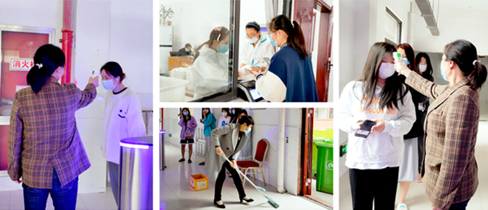 在这特殊的时期里,为防止聚集,学校食堂将堂食关闭,改成供应盒饭,每日提前统计校内师生三餐人数,定时定点给所有人员运送盒饭。为进一步改善就餐标准并避免聚集,食堂与学工部协作,制订了学生分时段取餐办法,并通过监督调查稳定菜价,保证学生吃饱吃好。学校物业除了日常卫生保洁外,对食堂、行政楼、教学楼、宿舍等公众区域每日两次消毒,对电梯、走廊等重点处进行多次消毒,保证校园每天的垃圾清运清理工作正常运转。封控期间,宿管阿姨们更是毫不懈怠,夜间查房量比以前增加一倍。她们随时关注学生情绪变化,关心他们身心健康状态,每天不定时对宿舍进行巡视,提醒同学们进宿舍先洗手消毒,不窜门不聚集,不使用违规电器,保持室内空气流通,及时倒垃圾,共同维护宿舍楼栋的清洁、安全。物业安保的全体工作人员始终坚守岗位,做到守土有责、守土担责、守土尽责,扎实有效地开展多项防控工作,为全体师生守好“防疫大门”,全方位守护校园安全。他们加大校园消防、夜间巡逻、围墙护栏巡查力度以及强化治安管控等,坚守岗位,尽职尽责,用责任和担当筑起了抗击疫情的坚固防线。