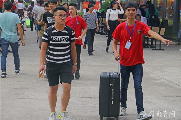迎新现场,穿着红色T恤的志愿者忙碌的身影随处可见,学生志愿者以及学生干部在统一安排下为迎新工作保驾护航,引导交通、搬运行李、车站接送、讲解报到顺序等等,贯穿了整个报到流程,从细节入手,勤勤恳恳,不仅极大方便了新生,也为迎新工作的顺利进行提供了有力保障。