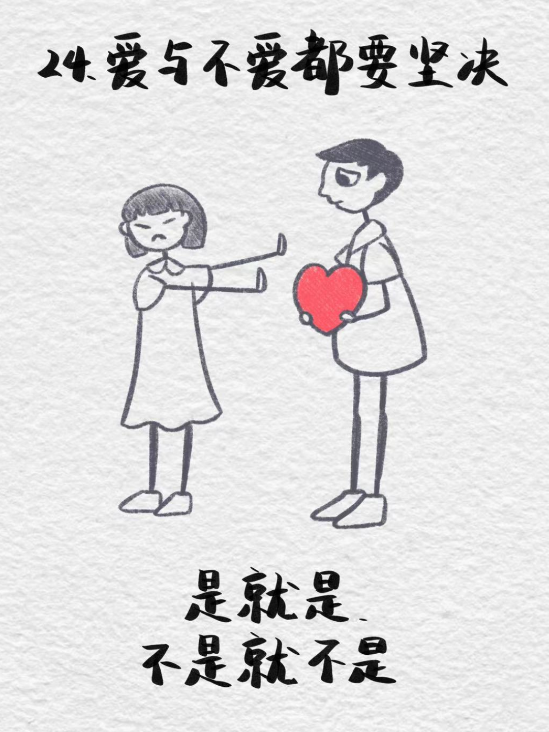 24.爱与不爱都要坚决。如果爱就勇敢说,如果不爱就坚决拒绝。如果你很了解他(她),也真心喜欢他(她),就勇敢地告诉他(她),追求你真正爱的人,只要自己认为值得,那就是值得的。“我爱你”这句话别对很多人说,希望你可以把这句话说给你心中真正最爱也最值得的人,这是尊重你爱的人,更是尊重你自己的感情。拒绝爱要坚决,爱你的人,向你表白时,不管你接不接受,你都应该感谢对方,这是对他们的尊重。如果你不爱他,他又向你表白了,一定要肯定回答,是就是,不是就不是,不可以模棱两可,给予他人盲目的希望。如果恋爱过程中,你看清了一个人,请你学会及时止损,勇敢的说再见。
