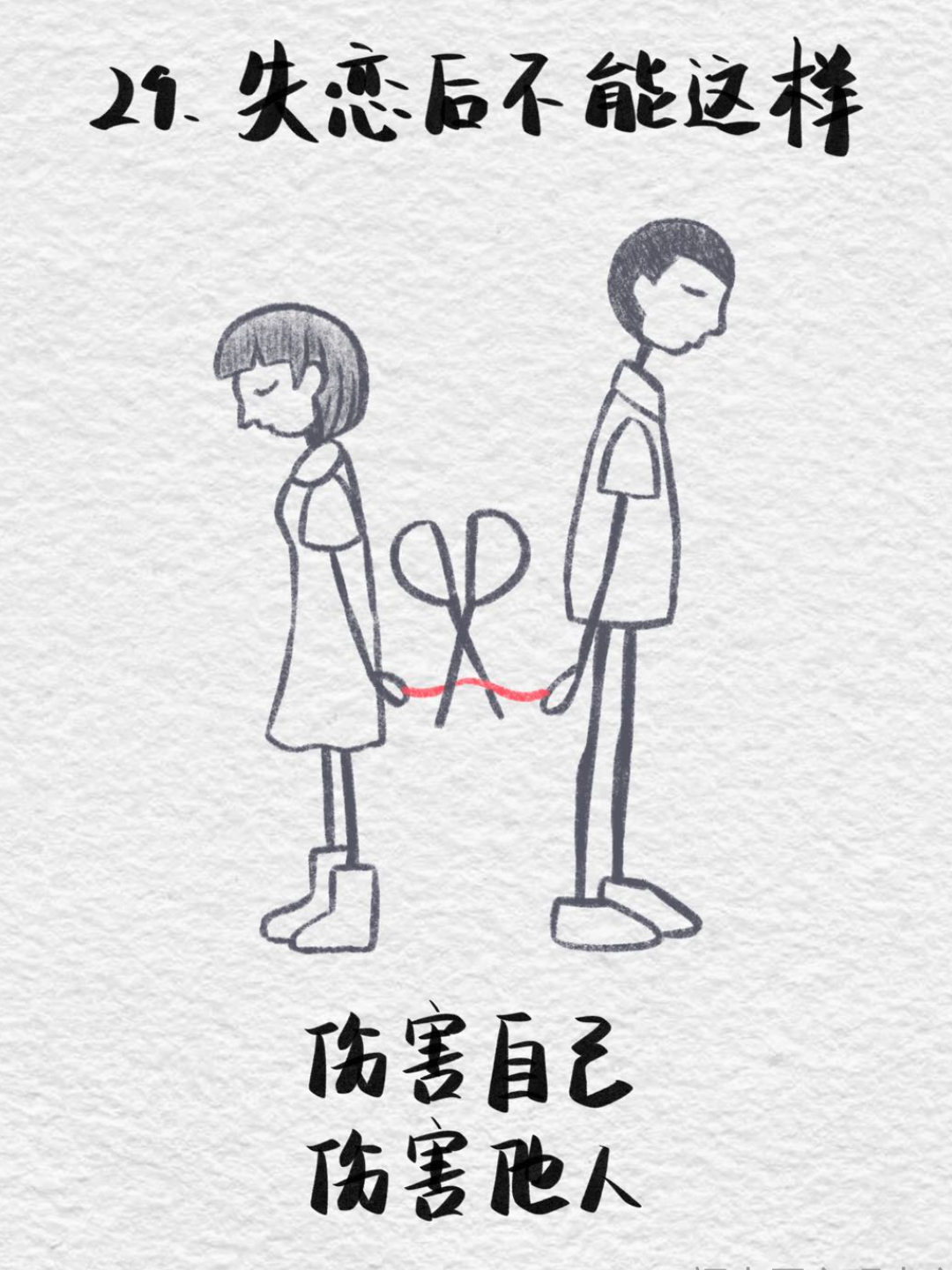29.失恋后不能这样。记得哦,失恋后最好不要继续做朋友,如果继续做朋友会带有很多情愫,恋爱就会分得不彻底,痛苦就会被延长。不能自暴自弃,更不能伤害自己,不能报复和伤害别人,也不能马上找个替代的人来安慰自己受伤的心灵。