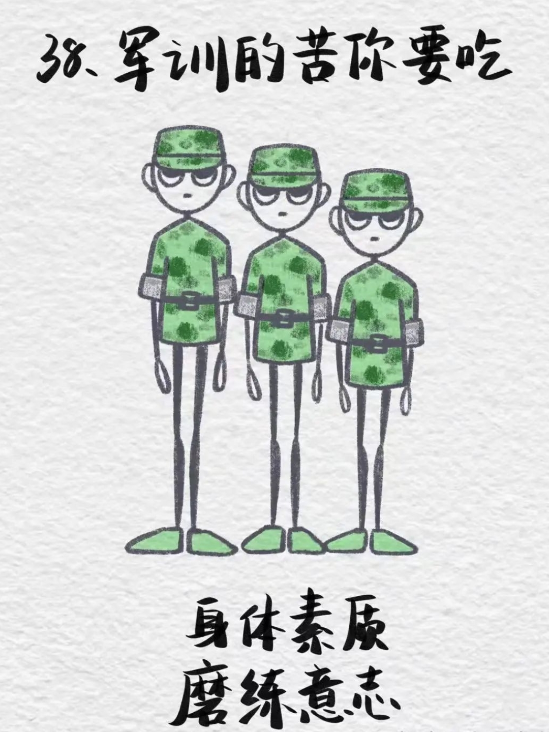 38.军训的苦要吃。军训是你们入学的第一课,是你们接受国防教育的一课,也是提升你们身体素质的一课,更是磨练你们意志的一课。至于苦与乐,只有经历过的人才知道其中的感受。等你走过军训这段时间,你才会怀念那一段短暂的时光,它会给你留下很深刻的印象,美好的回忆。所以,希望大家好好珍惜,不要以各种理由申请免训,或者总是找借口坐在旁边观看,抑或是一点点小困难就坚持不了。