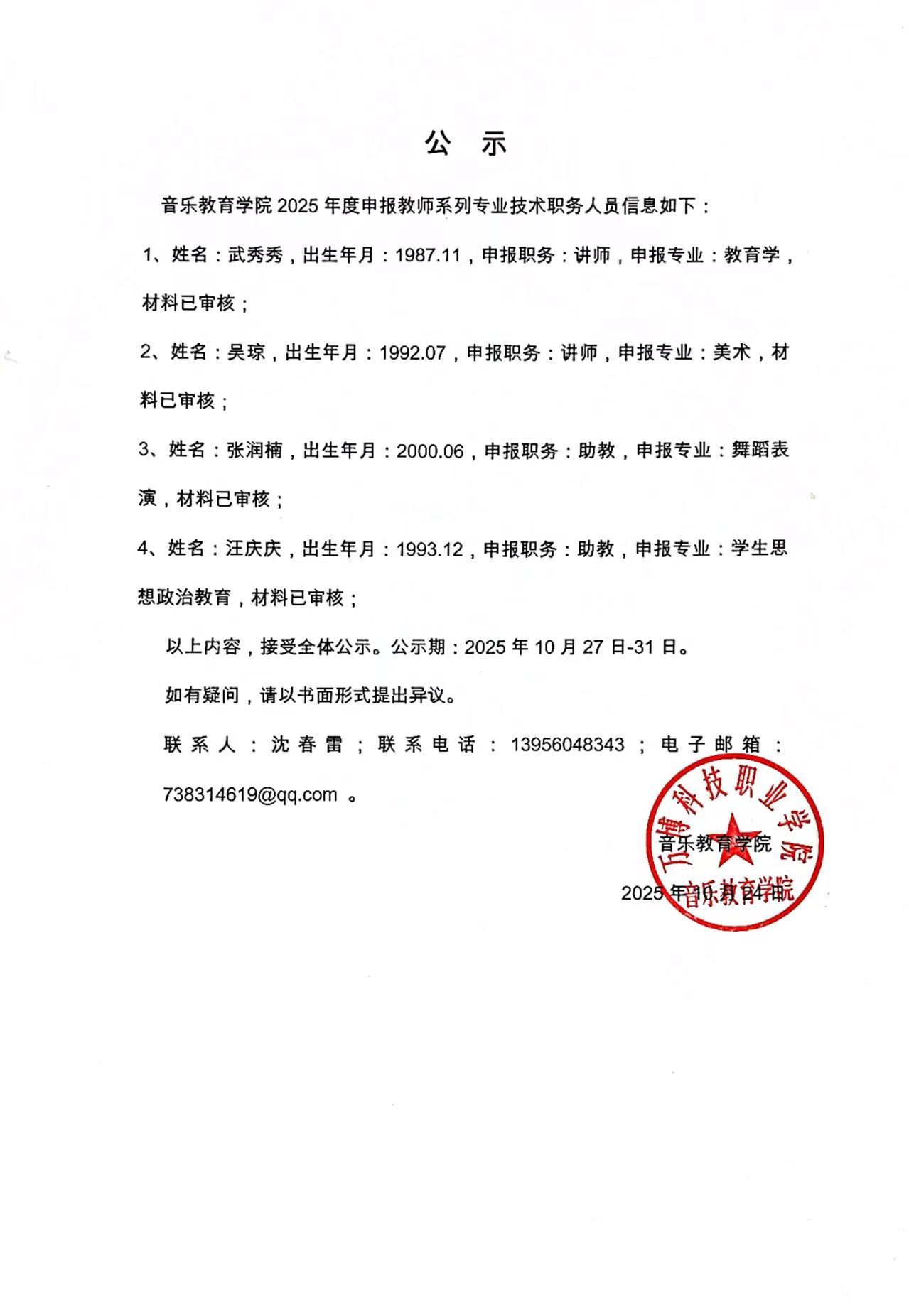 音乐教育学院2025年度申报教师系列专业技术职务人员信息公示