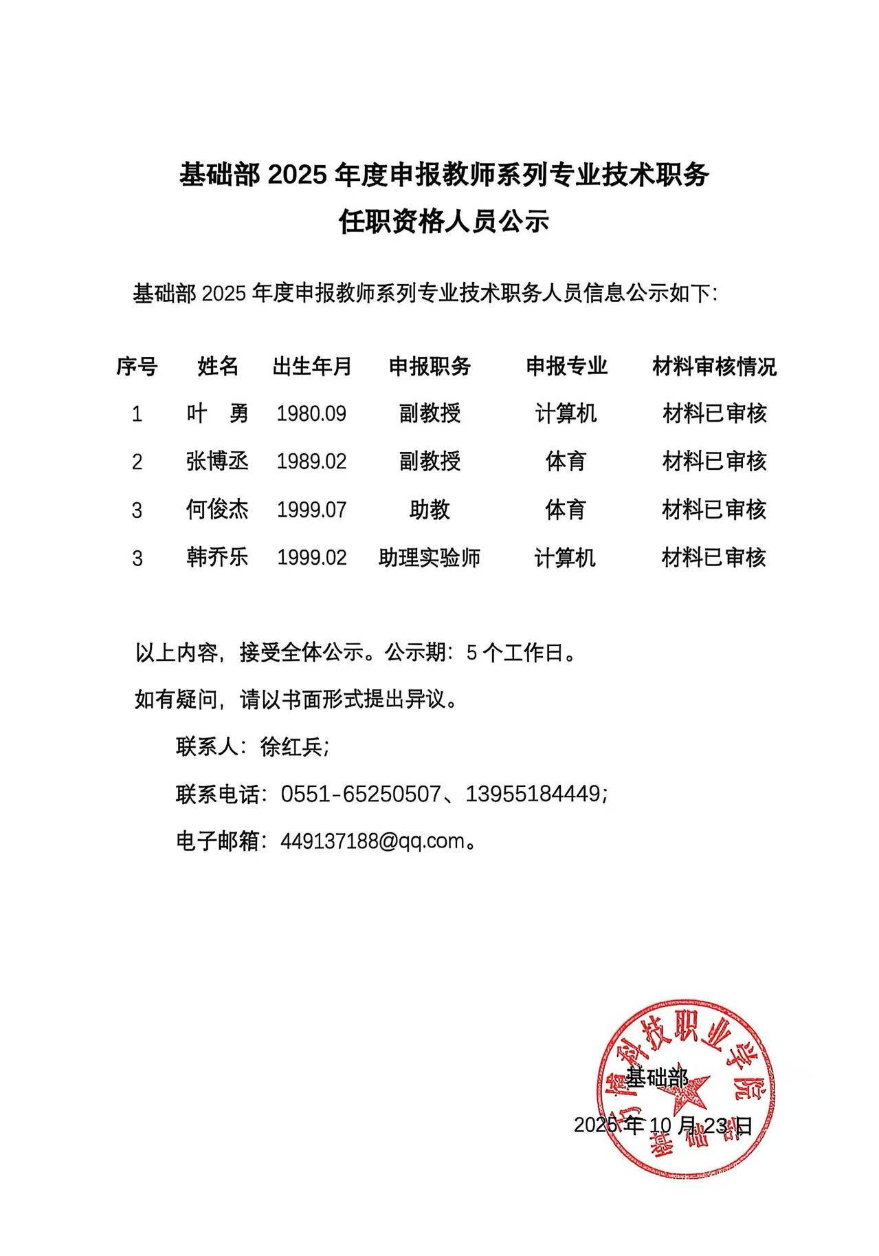 基础部2025年度申报教师系列专业技术职务人员信息公示
