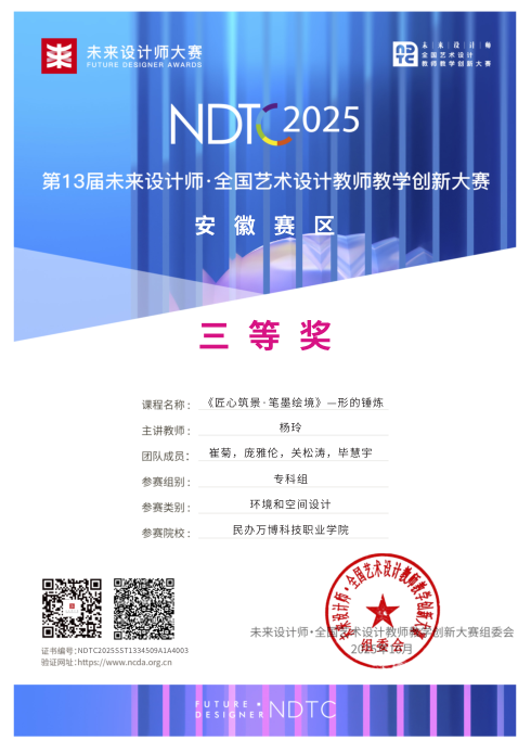近日,第13届未来设计师·全国艺术设计教师教学创新大赛省级赛顺利落幕。我校教务部积极组织艺术设计类专业教师参赛,共荣获二等奖1项、三等奖1项,学校再次获评省级“优秀组织奖”,也是安徽省内本届赛事中唯一获此殊荣的高职院校。