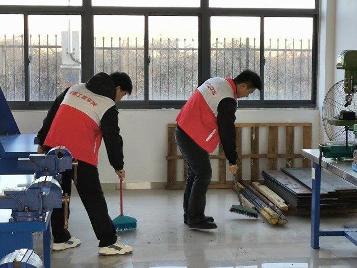 活动中,志愿者们身着红色马甲,全心投入实训楼的清扫工作。他们弯腰清除地面顽固污渍,仔细擦拭实训台的边边角角,小心清理仪器设备上的灰尘与碎屑,认真归类摆放散落的工具零件。大家分工明确、配合默契,从楼道走廊到各个实训室,不遗漏任何一处卫生死角。他们用双手为同学们营造出整洁安全的实训环境,在辛勤付出中收获了满满的成就感,也更加深刻地体会到维护实训空间、支持专业实践的责任与价值。