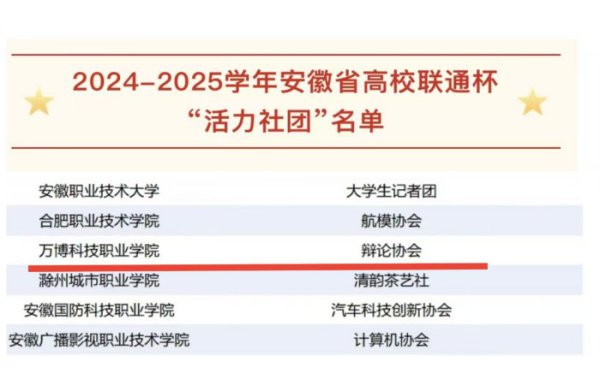 双社闪耀,载誉前行!我校两社团入围省级风采展,辩论协会斩获“活力社团”称号2025年11月7日,团安徽省委、安徽学联开展2024-2025学年安徽省高校联通杯“活力社团”风采展示活动汇报评审。我校辩论协会与青年志愿者协